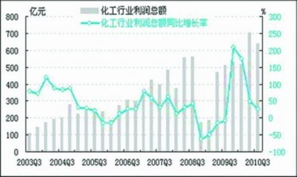 经初步季节调整,2010年三季度化工行业利润总额为641.5亿元,同比上升25.0%,同比增速较上季度下降24.7个百分点;环比下降8.9%,环比增幅转为负增长。原料成本下降等随机因素拉动化工行业利润43.5亿元。
