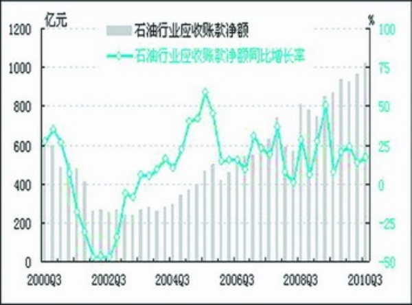 2010年三季度,石油行业应收账款净额为1020.7亿元,同比增长17.3%,同比增速较上季度上升3.5个百分点。
