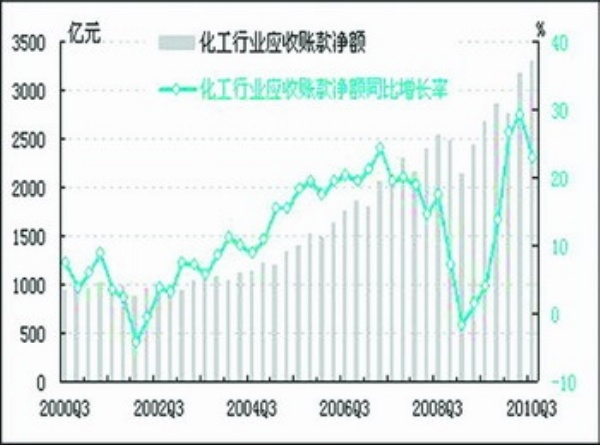 2010年三季度化工行业应收账款净额为3305.3亿元,同比增长22.8%,同比增速较上季度降低6.3个百分点。