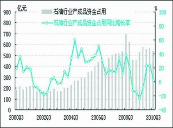截至2010年三季度末,石油行业产成品资金占用为540.9亿元,同比上升2.0%,增速较上季度放缓21.5个百分点,这是自2009年四季度以来首次增速下降。