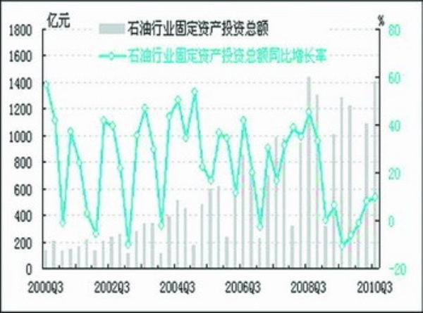经初步季节调整,2010年三季度石油行业固定资产投资总额为1411.8亿元,同比上升9.9%,同比增速较上季度提高1.8个百分点;环比上升29.6%。