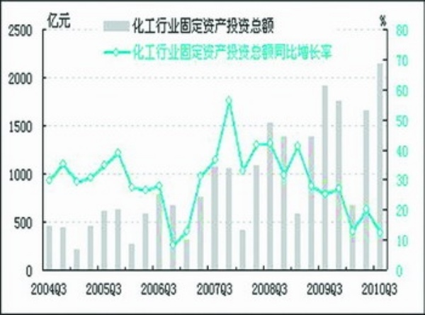 经初步季节调整,2010年三季度化工行业固定资产投资总额为2149.5亿元,同比上升12.5%,同比增速较上季度下降7.5个百分点;环比上升29.8%。对化工产业未来发展的良好预期等随机因素拉动固定资产投资额24.5亿元。