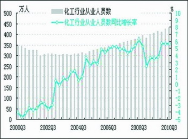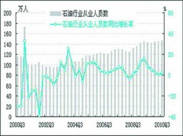 从业人员:2010年三季度,石油行业从业人员数为146.6万人,同比上升2.3%。化工行业从业人员数为431.9万人,同比上升5.66%。