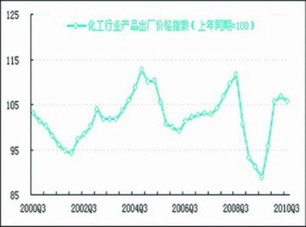 2010年三季度,化工行业产品出厂价格同比上涨5.7个百分点,涨幅较上季度收窄1.2个百分点。本季度面临化工产品需求淡季,并且受洪灾影响,产品价格涨势趋缓。
