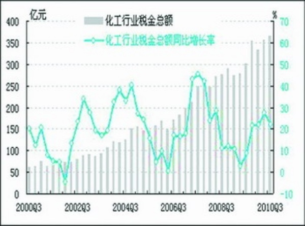 经初步季节调整,2010年三季度化工行业税金总额为366.7亿元,同比上升21.9%,同比增速较上季度下降5.7个百分点;环比上升2.9%,环比增速较上季度下降3.9个百分点。