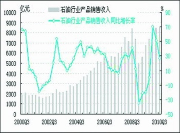 经初步季节调整,2010年三季度我国石油行业产品销售收入为8538.8亿元,同比增长26.4%,同比增速较上季度下降24.3个百分点;环比上升0.7%,环比增速较上季度微降0.3%。