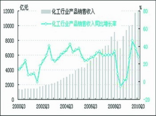 经初步季节调整,2010年三季度我国化工行业产品销售收入为11952.5亿元,同比增长27.7%,同比增速较上季度下降9.9个百分点;环比上涨2.0%,环比增速较上季度下降14.4个百分点。产品价格上涨预期等随机因素拉动化工行业销售收入37.5亿元。