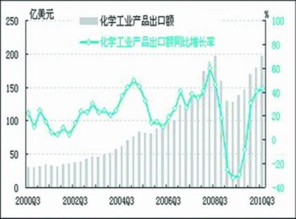 经初步季节调整,2010年三季度化工行业出口额为196.6亿美元,同比增长42.8%,同比增速较上季度上升2.3个百分点;环比上升9.9%,环比增速较上季度上升4.4个百分点。随机因素拉动化工行业出口额1.7亿美元,随机因素影响微小。