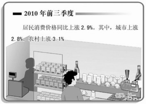 前三季度,居民消费价格同比上涨2.9%。其中,城市上涨2.8%,农村上涨3.1%。分类别看,八大类商品五涨三落:食品上涨6.1%,烟酒及用品上涨1.6%,医疗保健和个人用品上涨2.9%,娱乐教育文化用品及服务上涨0.6%,居住上涨4.1%;衣着下降1.1%,家庭设备用品及维修服务下降0.3%,交通和通信下降0.3%。9月份居民消费价格同比上涨3.6%,环比上涨0.6%。前三季度,工业品出厂价格同比上涨5.5%。9月份工业品出厂价格同比上涨4.3%,环比上涨0.6%。前三季度,原材料、燃料、动力购进价格同比上涨9.8%。