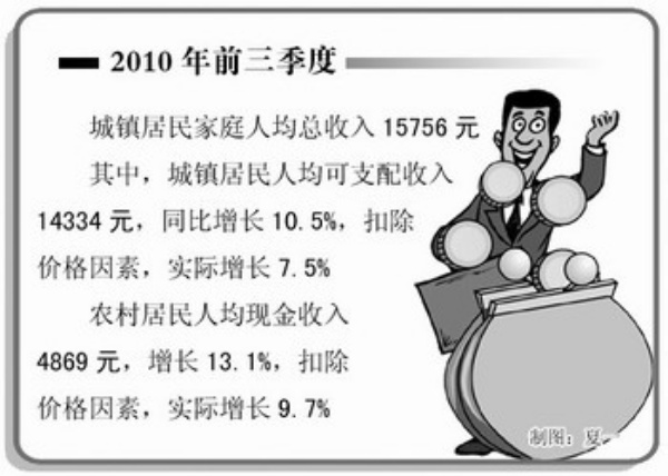 前三季度,城镇居民家庭人均总收入15756元。其中,城镇居民人均可支配收入14334元,同比增长10.5%,扣除价格因素,实际增长7.5%。在城镇居民家庭人均总收入中,工资性收入增长10.1%,转移性收入增长12.5%,经营净收入增长9.9%,财产性收入增长18.5%。农村居民人均现金收入4869元,增长13.1%,扣除价格因素,实际增长9.7%。其中,工资性收入增长18.7%,家庭经营收入增长8.7%,财产性收入增长19.4%,转移性收入增长17.2%。前三季度,扣除价格因素,城镇居民人均消费性支出实际增长6.3%,农村居民人均生活消费现金支出实际增长7.3%。