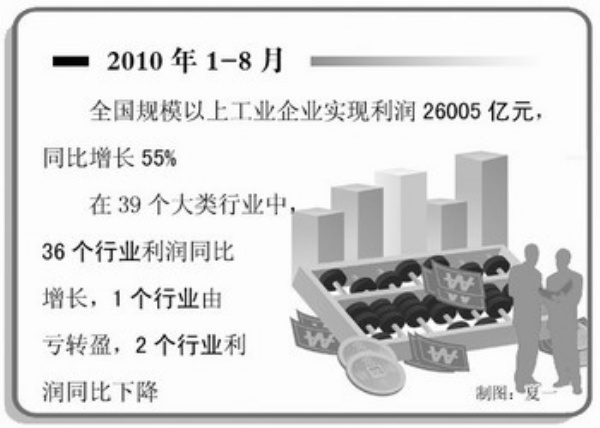 1—8月份,全国规模以上工业企业实现利润26005亿元,同比增长55%。在39个大类行业中,36个行业利润同比增长,1个行业由亏转盈,2个行业利润同比下降。