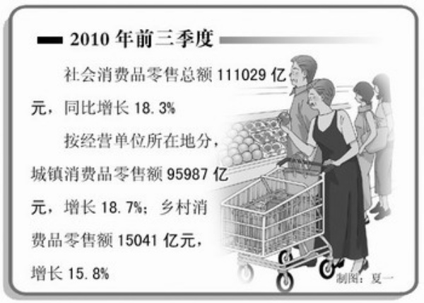 前三季度,社会消费品零售总额111029亿元,同比增长18.3%。按经营单位所在地分,城镇消费品零售额95987亿元,增长18.7%;乡村消费品零售额15041亿元,增长15.8%。按消费形态分,餐饮收入12632亿元,增长17.6%;商品零售98397亿元,增长18.4%。其中,限额以上企业(单位)商品零售额40945亿元,增长29.3%。热点消费快速增长。其中,汽车类增长34.9%,家具类增长38.4%,家用电器和音像器材类增长28.1%。