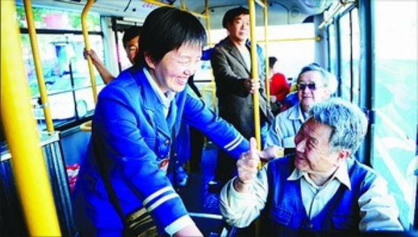 图3: 59路车队售票员陈立新热情周到的服务让乘客备感温馨。公交服务质量和服务水平的提高,不仅方便了百姓的出行,也关系着城市的文明形象。