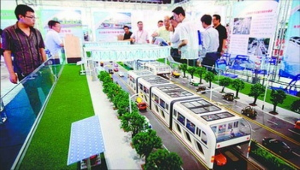 图5: 在北京国际科技产业博览会上,观众对新型零排放公交立体快巴模型特别感兴趣。