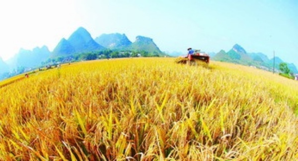 这是10月23日在广西靖西县鲁利村拍摄的田园风光。广西靖西县今年种植的18.7万亩晚稻已进入收割期,当地农民们抓紧时间收割。