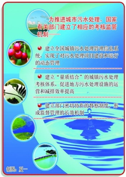 在考核监管方面,一是建立全国城镇污水处理管理信息系统,实现了对污水处理项目建设和运行的动态管理。二是建立“量质结合”的城镇污水处理考核体系,促进地方污水处理设施的运营和减排效率提高。三是建立部门密切协作的督察制度,形成监督管理的长效机制。