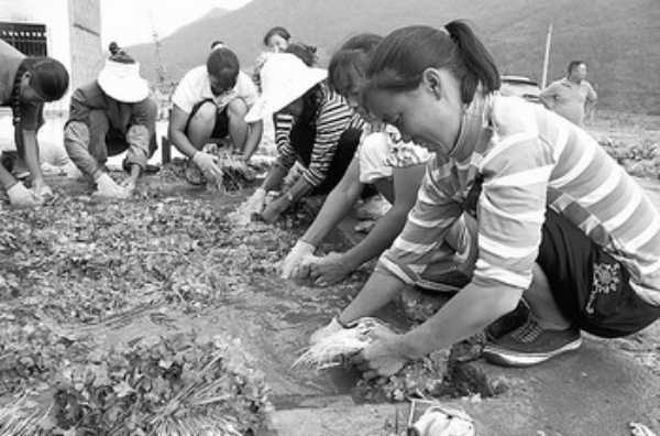 贵州省龙里县湾寨乡村民将土地出租,既可收到租金,又能在地里打工获得收入。图为村民在采收香菜。