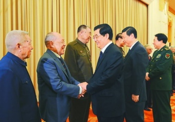上午9时45分,胡锦涛等领导同志来到人民大会堂西大厅,同参加过抗美援朝的老同志和志愿军英模代表亲切握手,向他们表示崇高敬意,并同他们合影留念。