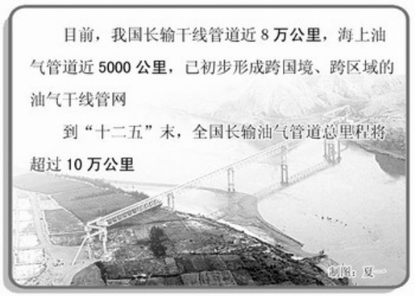 随着我国经济发展对油气资源需求的快速增长,我国干线管道的总长度迅速增加,一批国际原油管道陆续建成后,我国干线管道总长度将进一步增加,形成规模较大、跨国境和跨区域的输油气干线管网。到“十二五”末,我国长输油气管道总里程将超过10万公里。