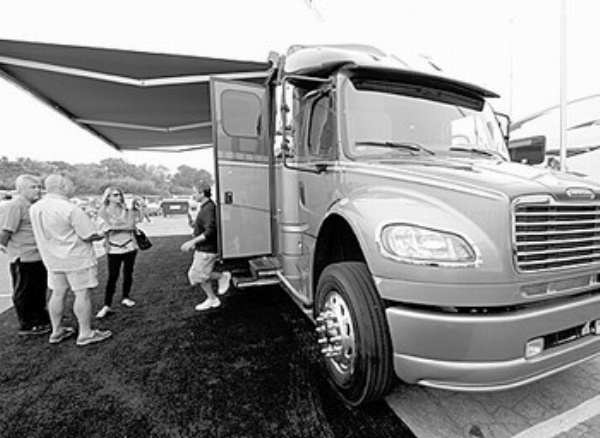 10月16日,2010年美国加利福尼亚州旅游休闲汽车展在加州波莫纳举行。图为人们在车展上参观一辆价值25万美元,由卡车改装的大型房车。
