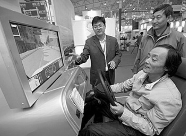 10月20日,第四届中国国际道路交通安全产品博览会在位于北京的全国农业展览馆开幕。图为参观者在博览会上体验汽车驾驶模拟器。