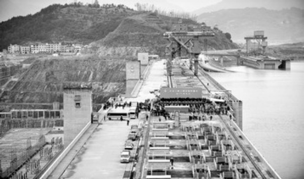 下图 三峡工程试验性蓄水至175米仪式现场(10月26日摄)。