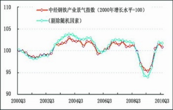 景气:2010年三季度中经钢铁产业①景气指数为100.8点(2000年增长水平=100②),较上一季度下降0.8点③,是连续3个季度回升以来的首次下降。