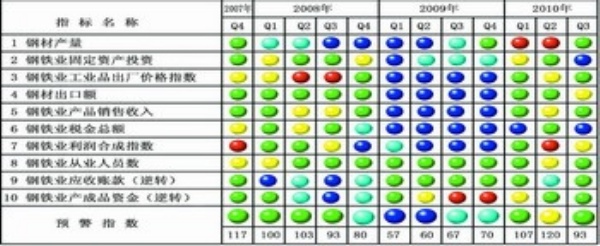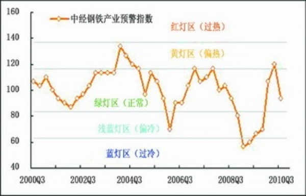 预警:2010年三季度,中经钢铁产业预警指数为93.3点,较上一季度大幅下降26.7点,从偏热的“黄灯区”迅速回落至正常的“绿灯区”,表明具有代表性的钢铁行业的状况,基本体现了宏观调控抑制行业运行过热的初衷。