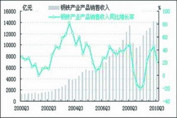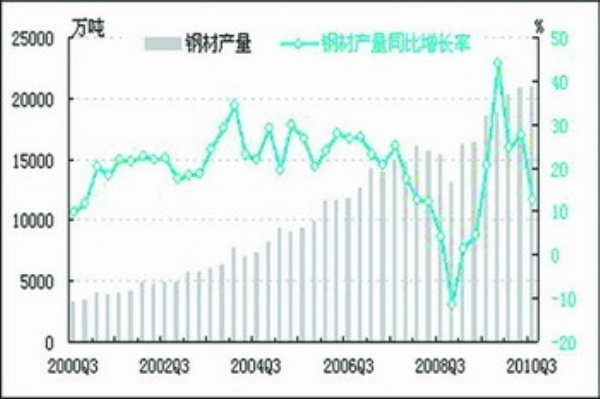 今年以来,钢铁行业产能增长过快导致钢材市场出现供过于求局面,4月下旬至7月下旬钢材价格连续12周下降,部分钢材市场价格已低于企业生产成本,钢铁行业利润状况不甚乐观,广大钢铁企业限产减产压力随之明显加大。三季度,由于受到房地产调控政策和部分下游行业用钢需求增速减缓影响,钢铁行业生产增速较上季度明显回落。与此同时,国家进一步加强宏观调控,进一步加大节能减排、淘汰落后产能工作力度,取消部分钢材产品出口退税,这些调控措施对钢铁行业产能的过快增长产生了抑制作用、有利于促进钢铁行业平稳健康发展。