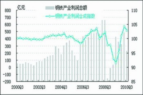 中经钢铁产业景气指数报告显示,2010年三季度,中经钢铁产业景气指数为100.8点,较上季度下降0.8点,仍然处于代表行业景气水平正常的100点以上。与上季度相比,三季度钢铁行业出口额(增速)明显上升,而税金总额、利润总额、产品销售收入、从业人员数和固定资产投资总额(增速)均呈回落态势。