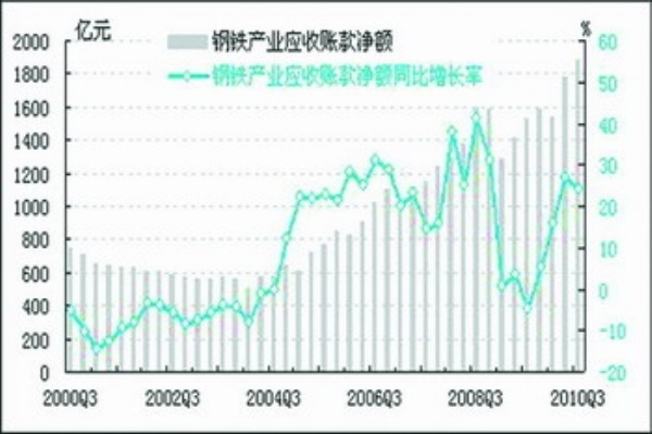 应收账款:2010年三季度,钢铁行业应收账款净额为1885.8亿元,同比上升24.3%,同比增速较上季度下降2.7个百分点。