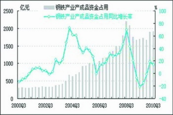 产成品资金占用:截至2010年三季度末,钢铁行业产成品资金占用为1917.1亿元,同比上升14%,增速较上季度放缓4.4个百分点,这是自2009年四季度以来首次增速下降。