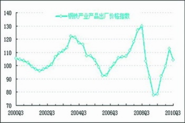 出厂价格:2010年三季度,钢铁行业产品出厂价格同比上涨4.0个百分点,涨幅较上季度收窄8.6个百分点。钢材价格经历了4个季度同比涨幅加快后,在本季度首度出现上涨趋缓。