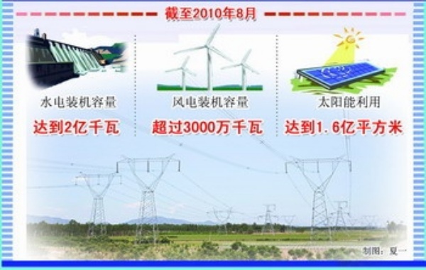 截至2010年8月底,我国水电装机容量达到2亿千瓦,约占全球装机总量的40%,排世界第一位;风电装机容量超过了3000万千瓦,占世界第二位,仅次于美国;太阳能利用达到1.6亿平方米,也居世界第一位,占全球使用量的60%,且发展势头良好。我国可再生能源利用总量约合2.25亿吨标煤,占全年能源消费总量的7.3%。