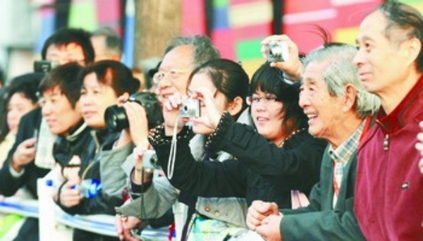 上图:10月28日,世博园区世博大道旁,观看花车巡游的游客纷纷举起相机,记录下一个个精彩瞬间。 本报记者 赵 晶摄