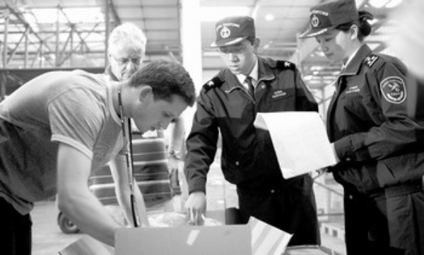 图!:深圳海关关员正在查验企业货物。 李义霖摄
