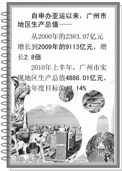 广州借举办亚运之东风,还提升了城市形象,改善了投资环境,促进了经济发展,增加了就业岗位。预计今年广州地区生产总值将突破1万亿元大关。