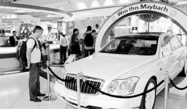 随着全新三号航站楼的投入运营,迪拜国际机场接纳旅客人数显著增长,机场免税店营销业绩随之大幅攀升。据统计,截至9月底,迪拜机场免税商品累计销售额已超过8.77亿美元,较去年同期增长14.5%。图为迪拜机场免税店推出的购物抽奖赢豪华轿车活动吸引了众多旅客的目光。 本报驻阿布扎比记者 经 凯摄影报道