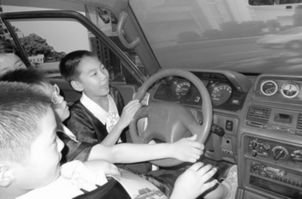图 1 在测绘科技馆里有一辆多功能智能汽车。图为学生们正在体验自动驾驶。 本报记者 徐 红摄