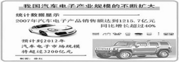 统计数据显示,2007年我国汽车电子产品销售额达到1215.7亿元,同比增长超过40%。预计到2012年,我国汽车电子市场规模将超过3200亿元。汽车电子产业的快速兴起,得益于我国汽车市场的持续增长。2009年,我国汽车产销量分别为1379万辆和1364万辆,预计今年将分别达到1500万辆左右。另一方面,也得益于汽车市场竞争加剧和汽车产品的持续升级。