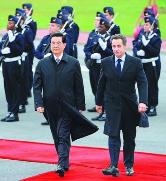 图: 11月4日,国家主席胡锦涛在巴黎奥利机场出席法国总统萨科齐举行的隆重欢迎仪式。这是胡锦涛主席在萨科齐总统陪同下检阅仪仗队。