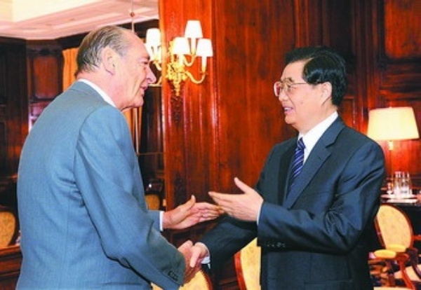 图:11月5日,国家主席胡锦涛在巴黎会见法国前总统希拉克。