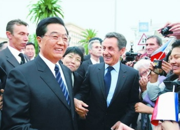 11月5日,国家主席胡锦涛与法国总统萨科齐在尼斯市街头同闻讯而来的民众亲切交谈。 新华社发