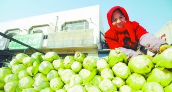 11月5日,在银川市北环蔬菜批发市场,商贩正在码放冬储大白菜准备装车。进入11月份以来,银川市场的冬储大白菜开始大量上市。 新华社记者 彭昭之摄