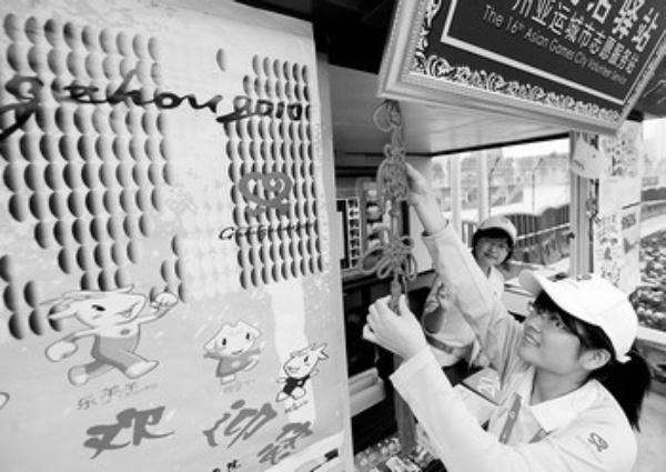 11月6日,广州市天河区一处亚运城市服务站点,志愿者正在热情服务。广州亚运会即将开幕,600个亚运城市志愿者服务站点装饰一新,59万名志愿者全面上岗,开始服务亚运。 本报记者 赵 晶摄