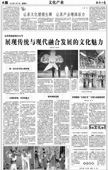 在空间布局上,西城区将构建“一核一带多功能区”的产业发展空间布局。“一核”即金融核心;“一带”是指北京中轴线西翼特色文化带,覆盖什刹海、大栅栏、琉璃厂和天桥等主要文化特色街区,打造传统与时尚交相辉映的新型文化走廊;“多功能区”是指德胜科技园、广安产业园、天桥演艺园区等产业园区,努力打造西城区新的经济增长极。可以说,优化配置各类资源,聚力打造文化聚集区,重点发展文化产业,努力将文化资源优势转化为区域发展的软实力和经济优势,将是西城区大力推动北京城市功能核心区文化发展的崭新思路。在宣南文化节开幕式上,西城区有关领导正式向外界发布西城区推动北京城市功能核心区文化发展重要举措: