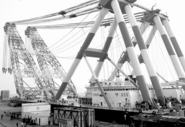 11月8日,8000吨起重船靠泊在上海长兴岛专用码头。当日,上海振华重工向韩国三星重工交付8000吨浮式起重船(浮吊)。该起重船共配有11台60吨绞车,技术难度大。该起重船的建造及交付,标志着上海振华重工在大型海洋重工装备领域的又一次巨大成功。 新华社记者 陈 飞摄