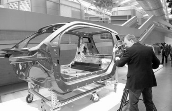 德国宝马汽车公司日前在德国东部城市莱比锡宣布,公司将投资约4亿欧元扩建其莱比锡工厂,以生产计划于2013年面世的全球首款以碳纤维塑料为车身材料的量产电动汽车。图为一名记者在拍摄未来宝马都市电动车拟使用的轻质碳纤维车身结构。 新华社发