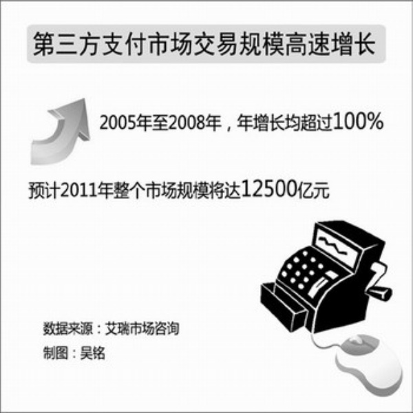 我国电子商务风生水起的背后,正是电子支付平台的快速发展。据艾瑞市场咨询公司发布的报告,2005年至2008年,我国第三方支付市场交易规模年增长都超过了100%。2011年,整个市场规模预计将高达12500亿元。电子支付行业为提高社会整体运行效率做出了巨大的贡献。