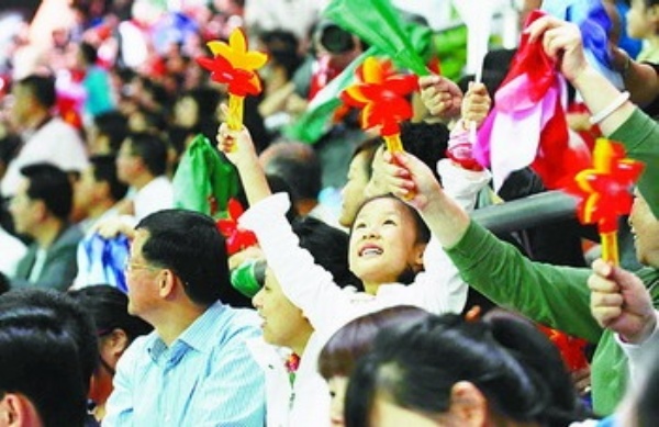 在第十六届亚运会开幕式现场,观众为精彩的演出热烈欢呼。